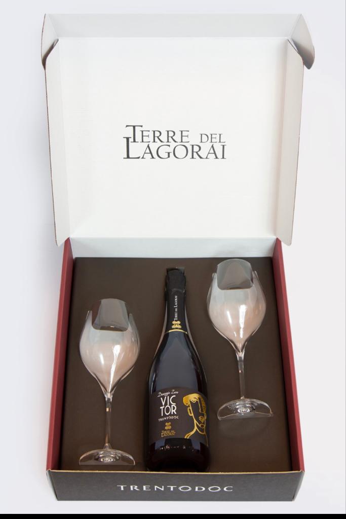 Box di Natale con due calici firmati Terre del Lagorai e una bottiglia a scelta