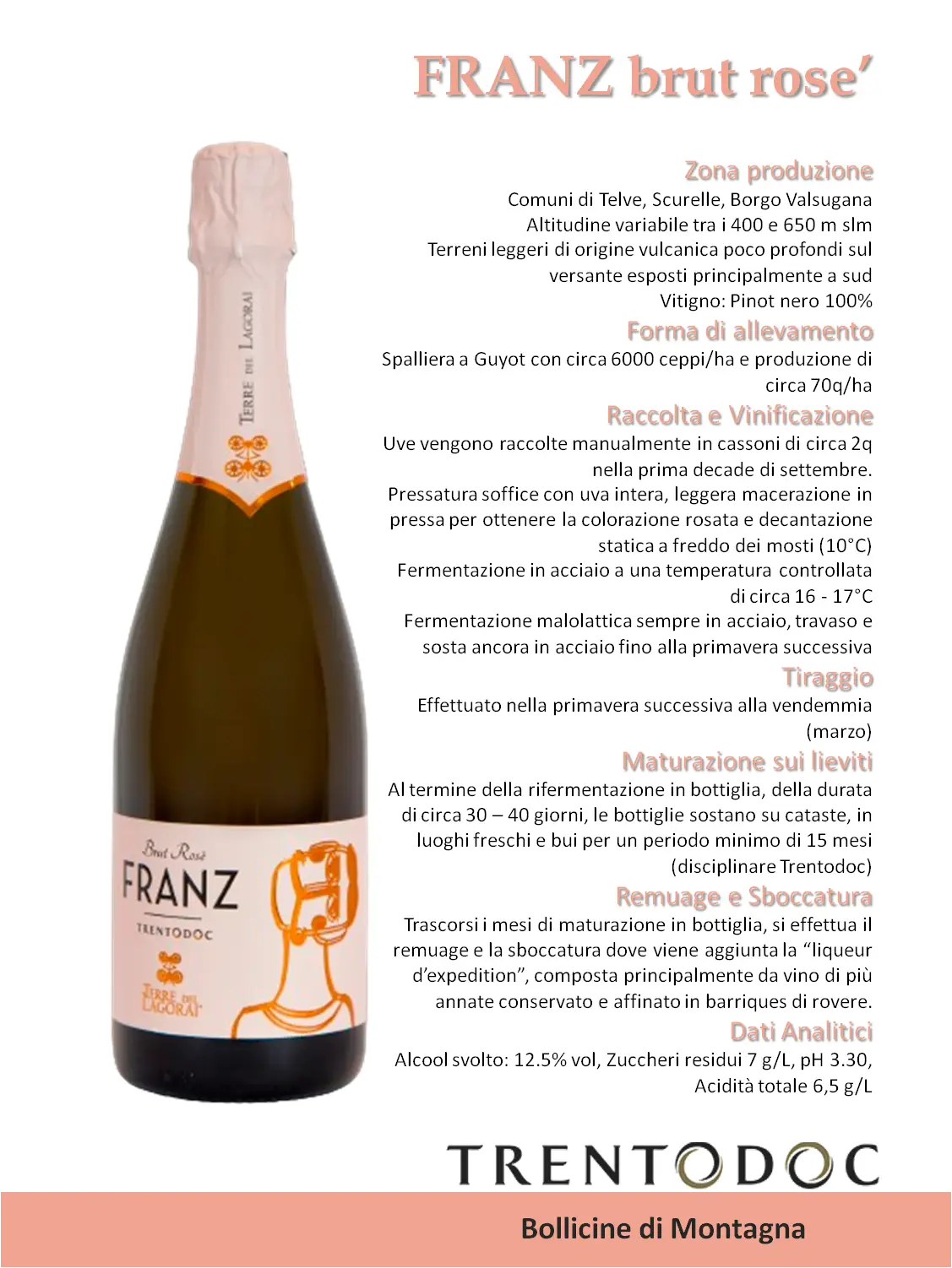 Franz Brut Rosè prodotto da uve di Pinot nero 100%. Un Trentodoc rosato dai riflessi ramati con perlage fine de elegante che coniuga tutta l’eleganza e la profondità della varietà alla naturale gentilezza dei migliori Rosè. Profumo ampio e complesso con sentori di frutti rossi che ricordano i caratteri del vitigno.